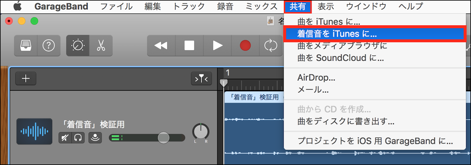 ④ 「共有」メニュー >「着信音を iTunes に」を選択。