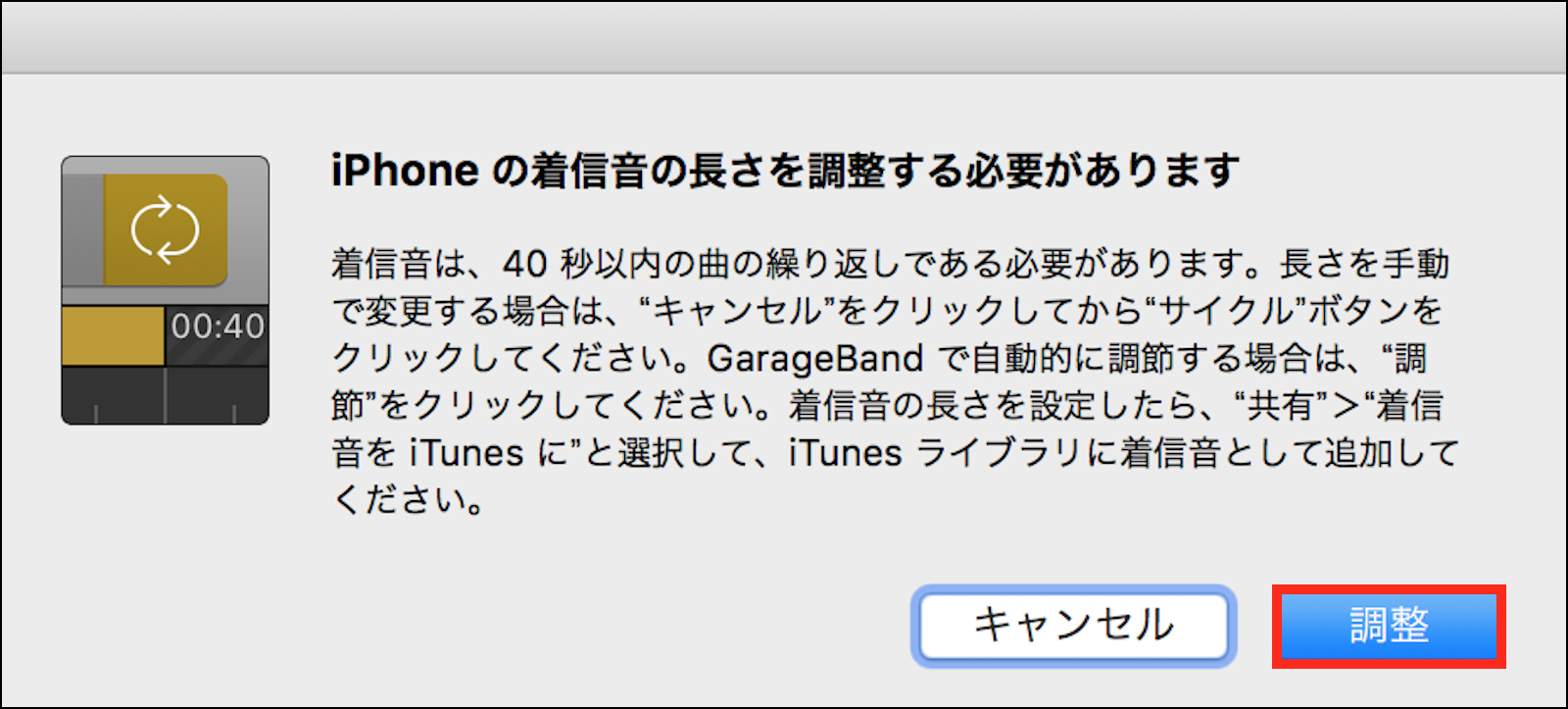 ⑤ 下の画像の様なダイアログが表示されますので、「調整」ボタンをクリック。