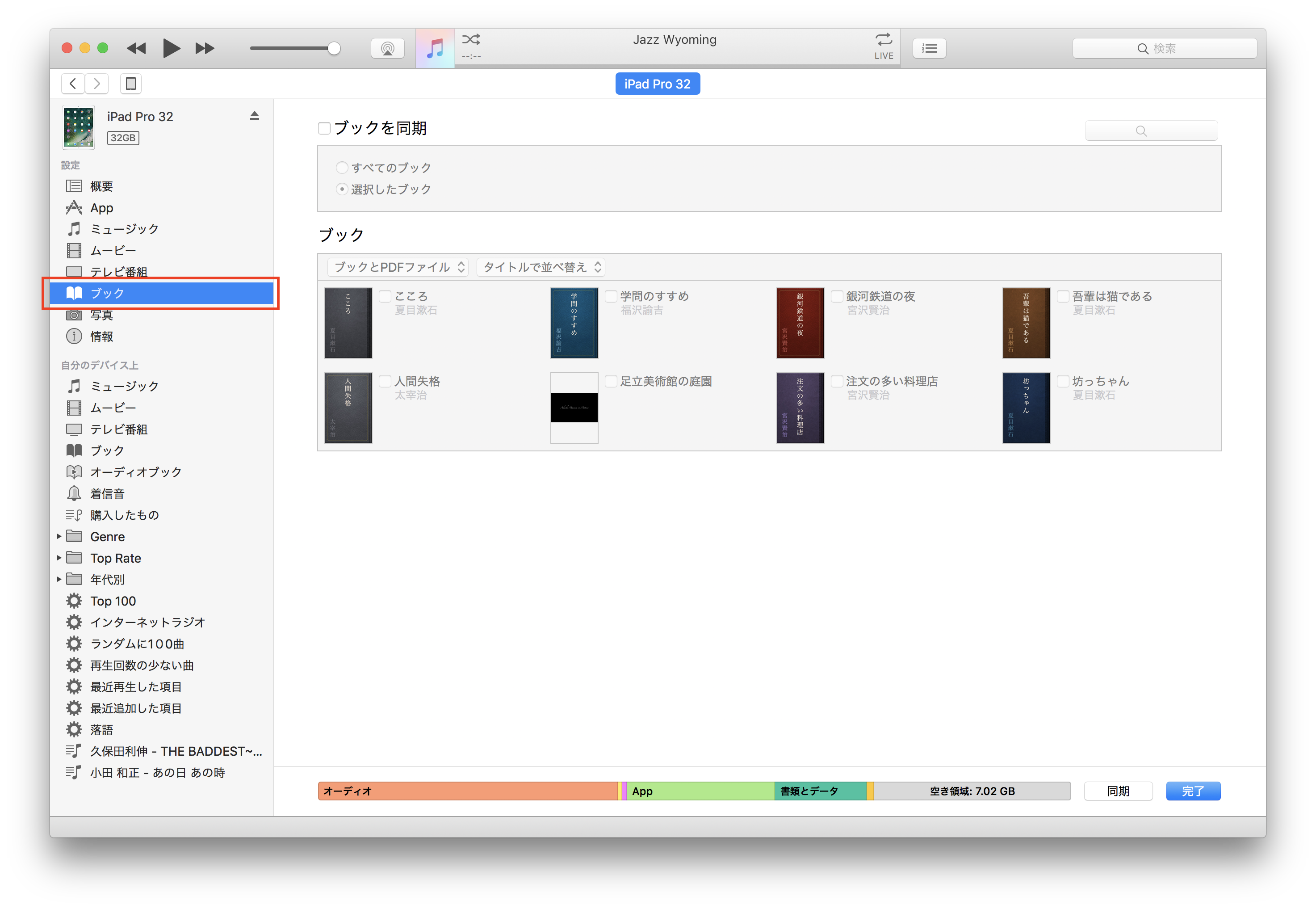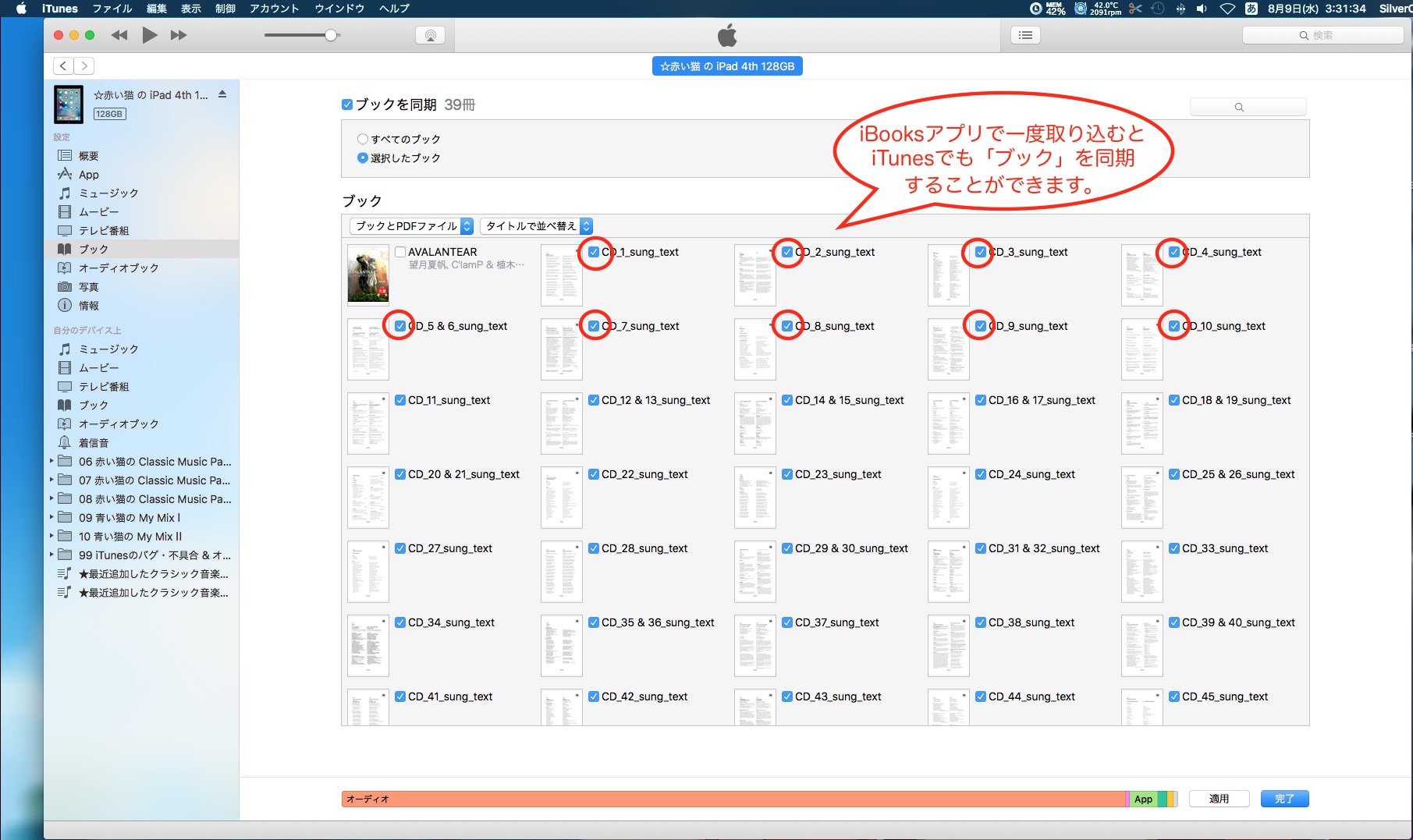 (2)次に iTunesを開いて、同期画面で「ブック」の同期に「チェック」を入れて(「すべて」でも「選択」でも…さらに「チェック」して…)同期する「ブック」を選択します。