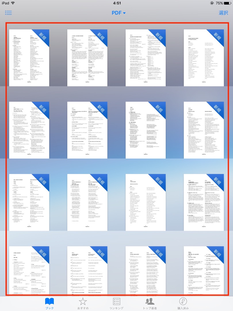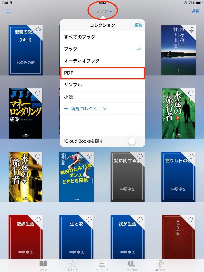 (4)同期(転送)が終了したら…今度は、iOSデバイス側の「iBooks」アプリをタップして、開いて…「PDF」を選択すると「同期(転送)」されたPDFファイルを閲覧することができます。
