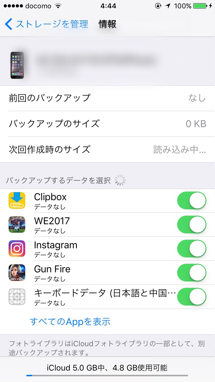 iCloudのバックアップの次回作成時のサイズがずっと読み込み中になっています