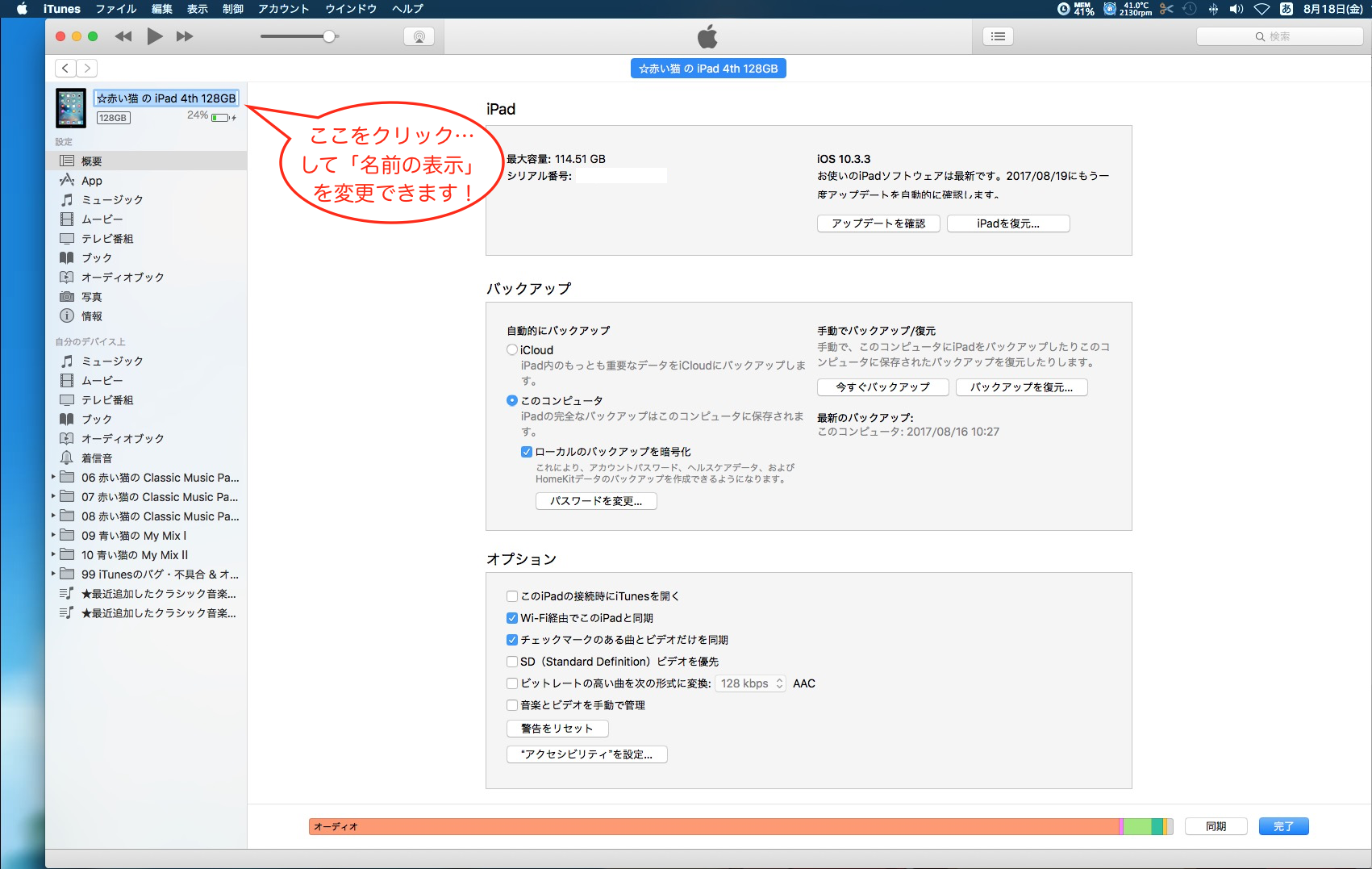 「同期画面」に表示される「○○(親族名)のiPod」をクリックすれば…そこで「名称」を変更出来きました(汗)