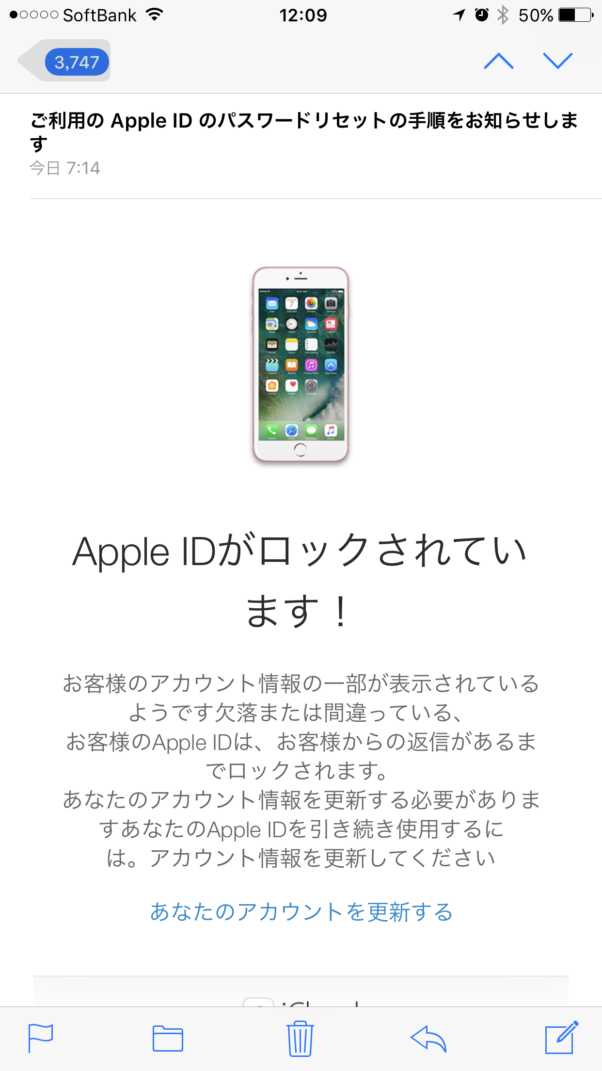 Apple IDの管理サイトの正規のURLは、https://appleid.apple.com/ です。 メールの『アカウントを更新する』に指を乗せると(タップしない)、URLが表示されます。 それが、短縮URLになっていたり、正規のURLと異なることを確認して下さい。 同じ様なメールが大量に出回っています。 こちらのリンク等もご確認下さい。
