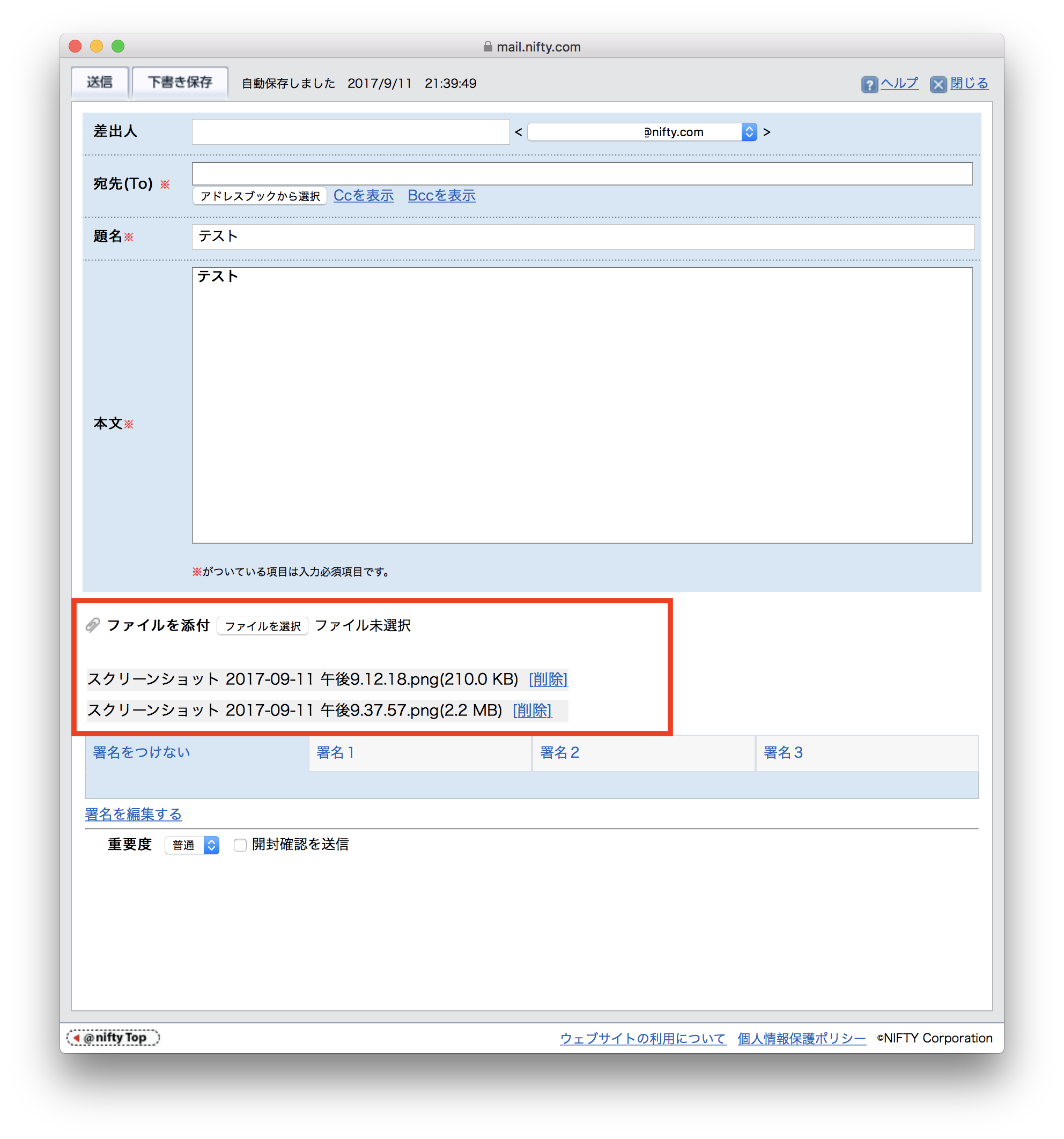 SafariでニフティーのHPを開いて、そこのブラウザメールで添付ができません。