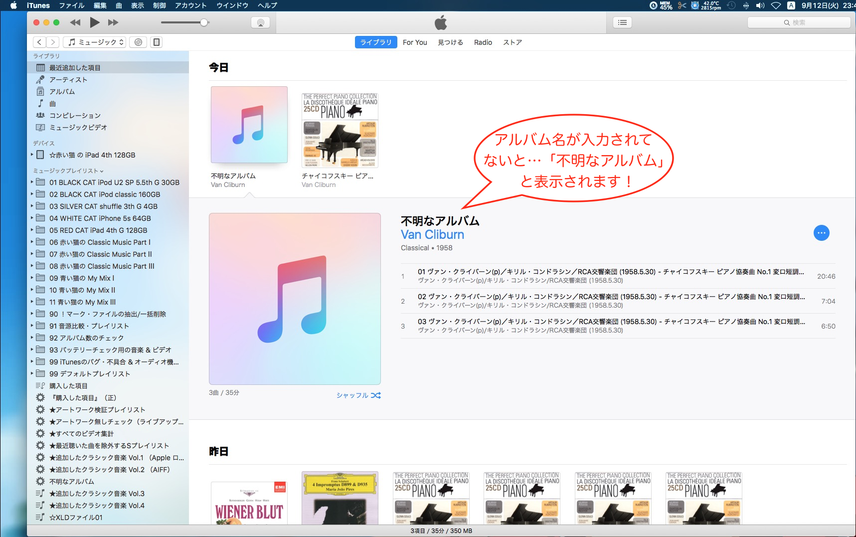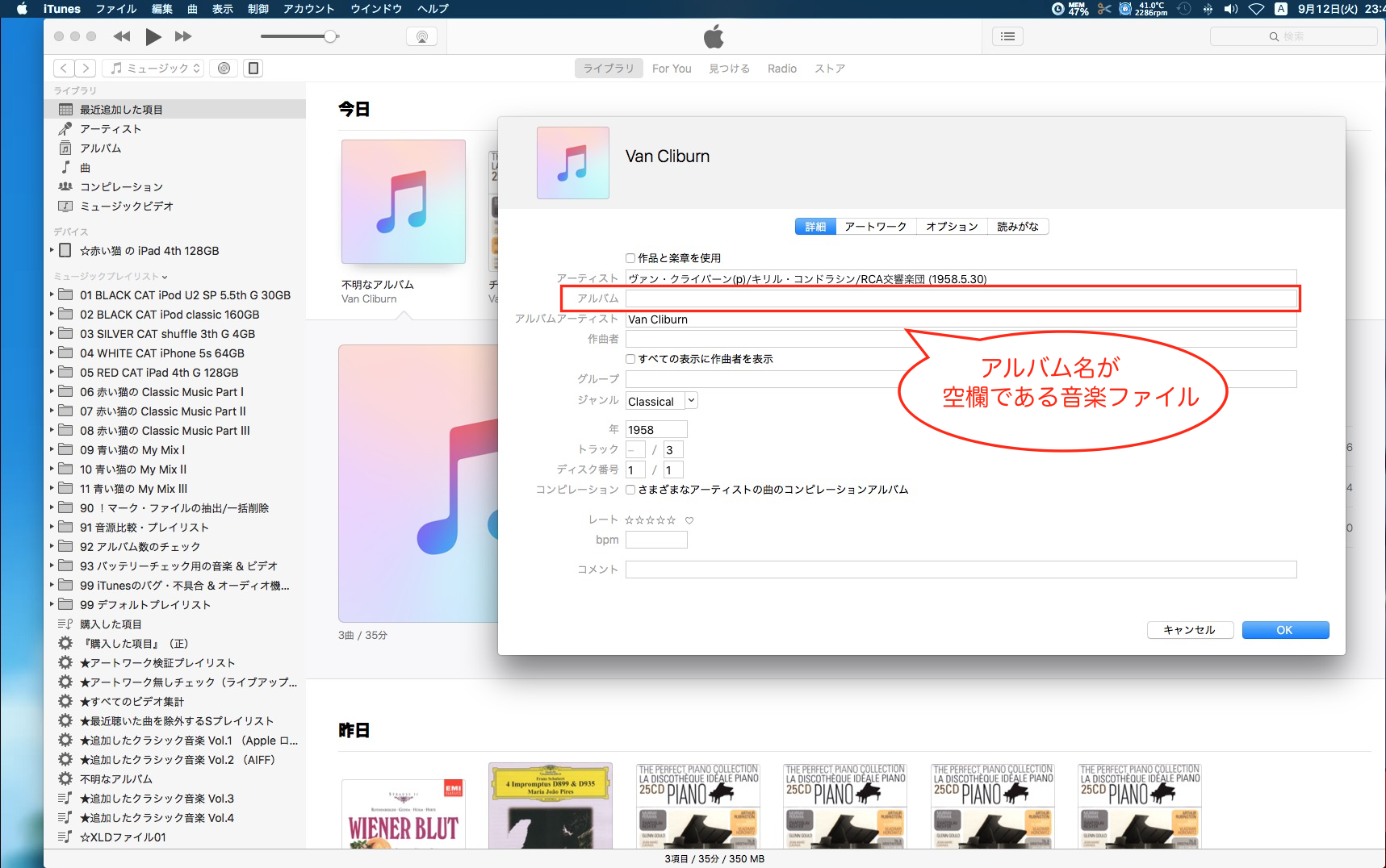 mp3ファイルとしてダウンロードした曲をiTunesに追加しました。これらは全てアルバム名のところを空欄にしてあります。スマートプレイリストで、「アルバム名が空欄にしてある曲」というまとまりでプレイリストを作成したいのですが、「アルバム」が「”空欄”」である というような、スマートプレイリストで”空欄”を選択できるような設定がありましたら教えていただきたいです。お願いします。