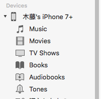 デバイス iPhoneのところにミュージック、ムービー、テレビ番組、Podcast、ブック、オーディオブック、着信音とあります。