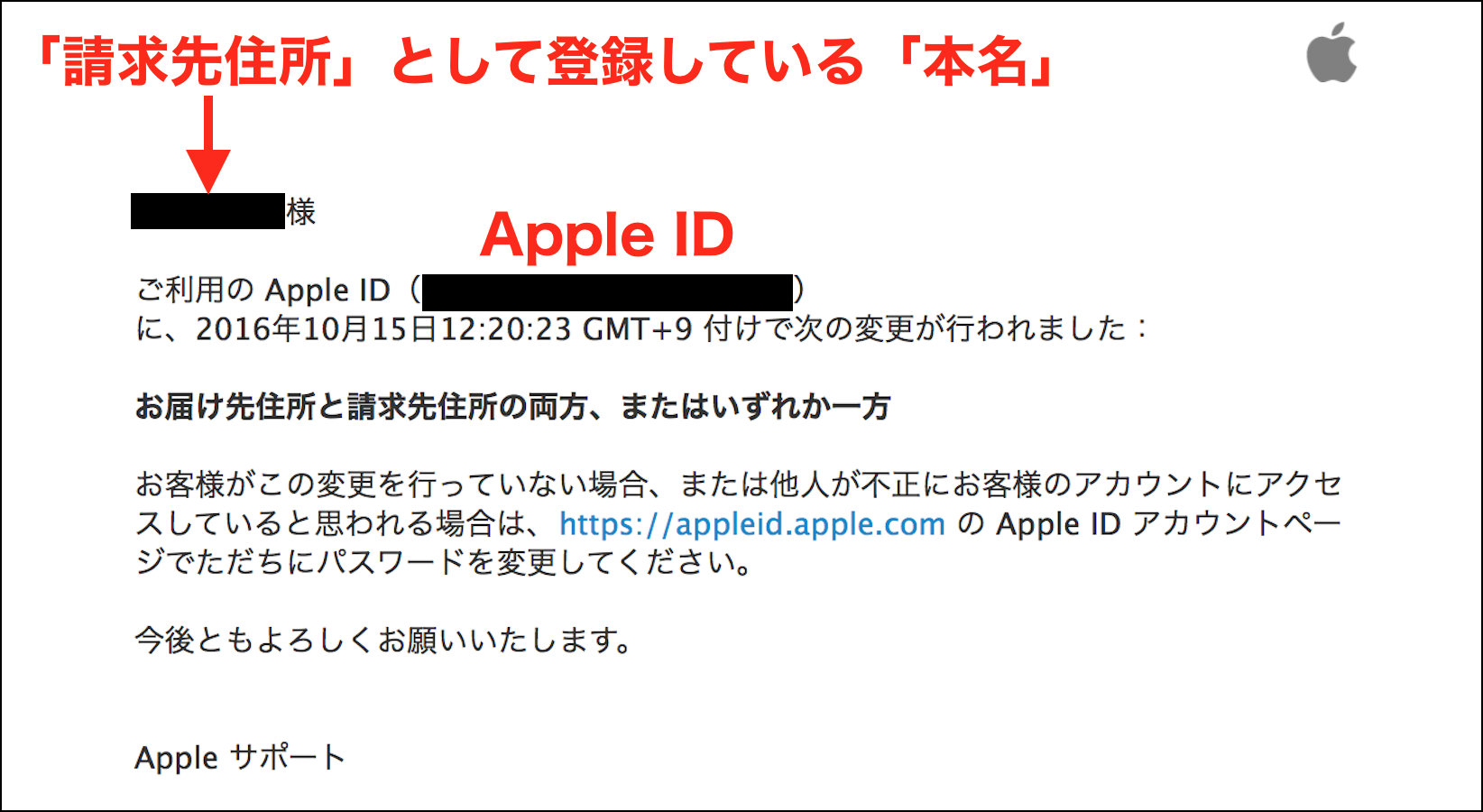 1)ご使用のApple IDに登録している住所が変更されたというメールですよね。 その場合、My Apple IDの管理サイトで実際に請求先の住所の情報が変更になっているかどうか、確認してみるとどうでしょうか?