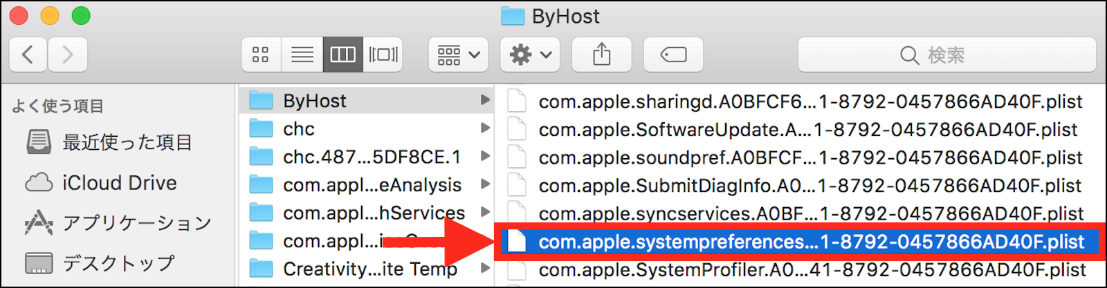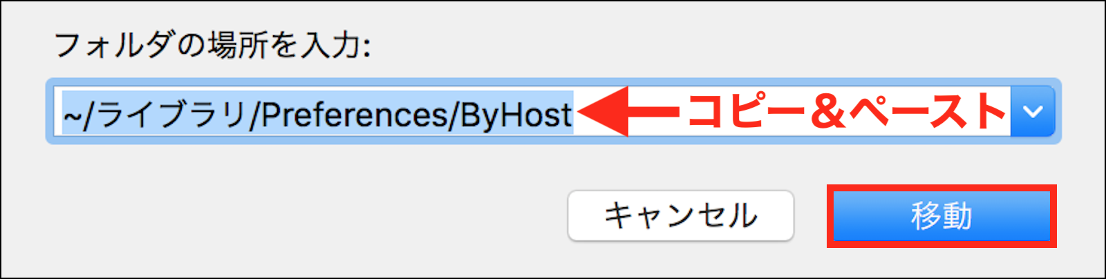 間違い無い場合は、先程と同様に「Finder」を開き、「移動」メニュー >「フォルダへ移動」を選択すると表示されるダイアログの入力フィールドに、 ~/ライブラリ/Preferences/ByHost をコピー&ペーストで入力して「移動」ボタンをクリックして下さい。