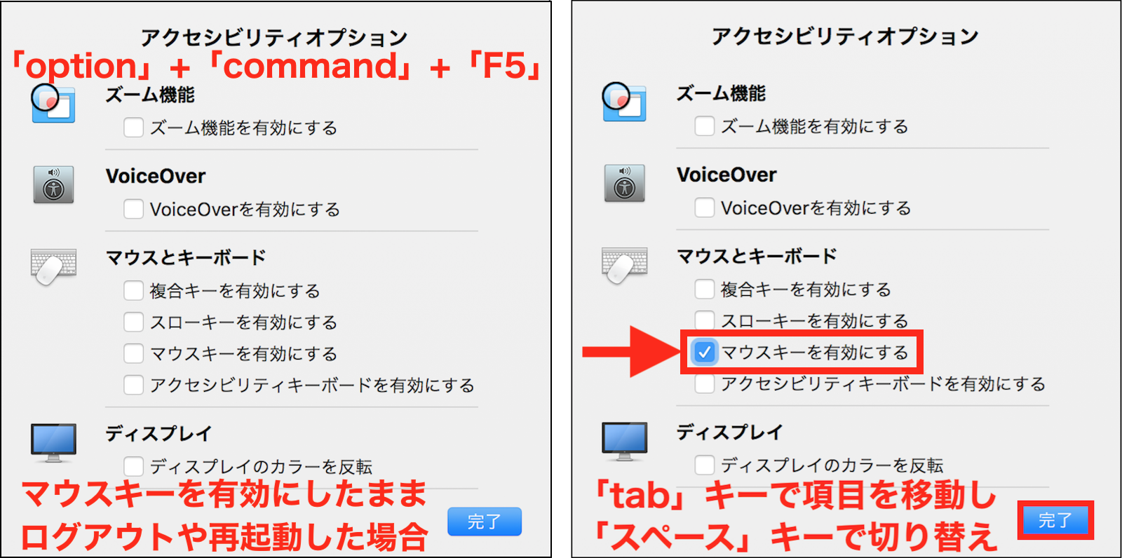 私の環境は macOS High Sierra(10.13)ですが、「システム環境設定」>「アクセシビリティ」>「マウスとトラックパッド」>「マウスキーを有効にする」の項目にチェックを入れた状態で、ログアウトまたは再起動した場合、ログイン画面にて「option」+「command」+「F5」キーで、「アクセシビリティオプション」の設定パネルを表示させても、下の画像左側の様に、「マウスキーを有効にする」の項目は無効になっている為、問題無くパスワードを入力してログインする事が出来ます。