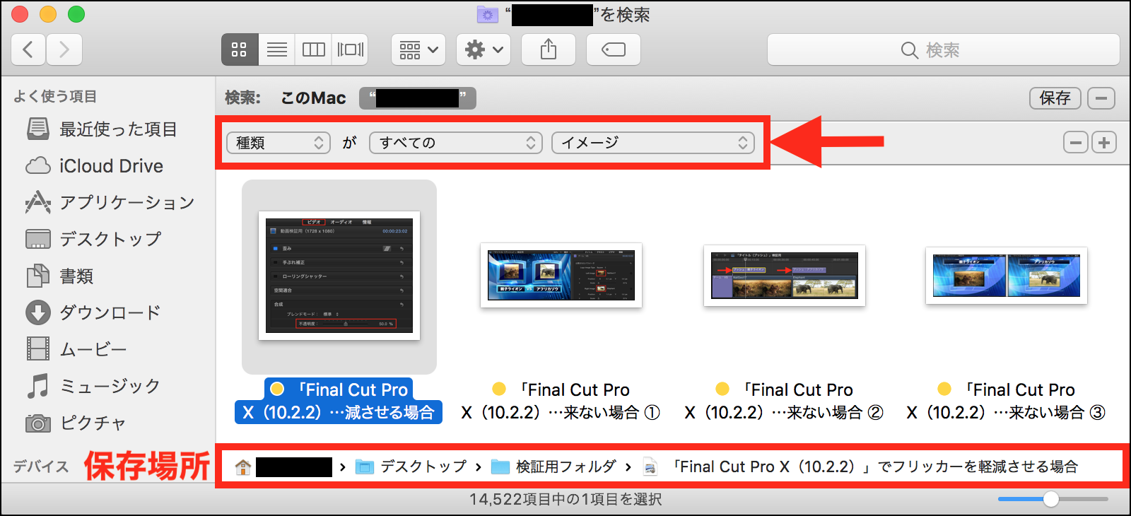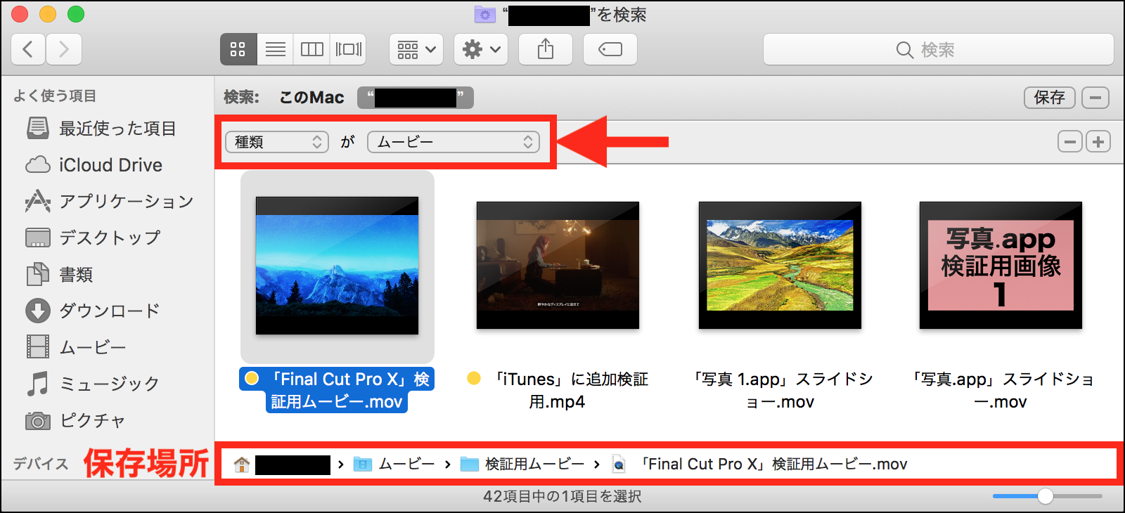 同様にして、「条件検索」バーの「種類」が「ムービー」を選択すると、「ホーム」フォルダ内のすべての動画ファイルが検索されます。