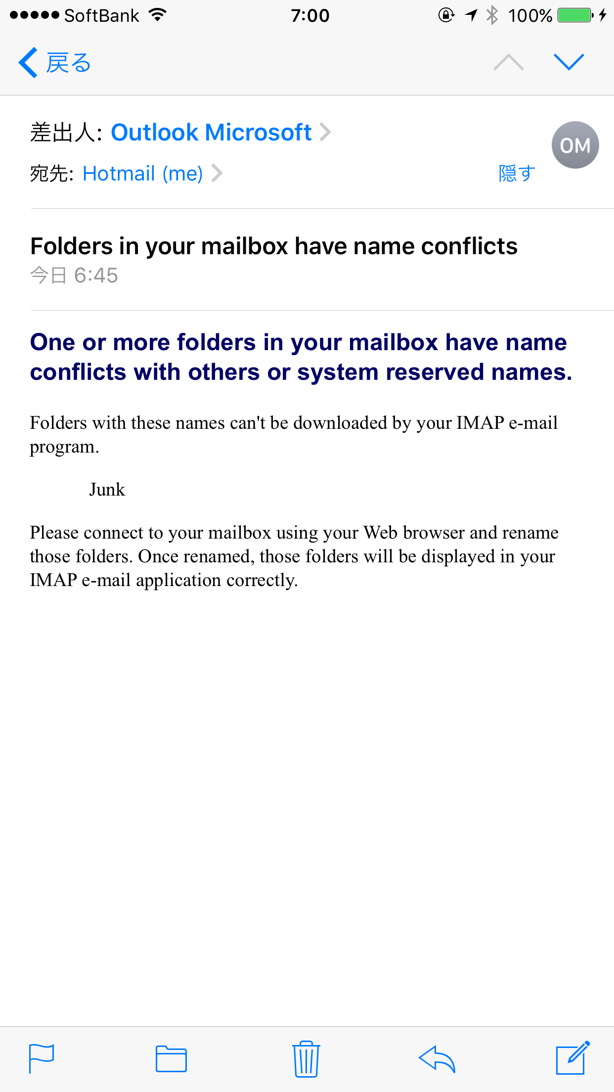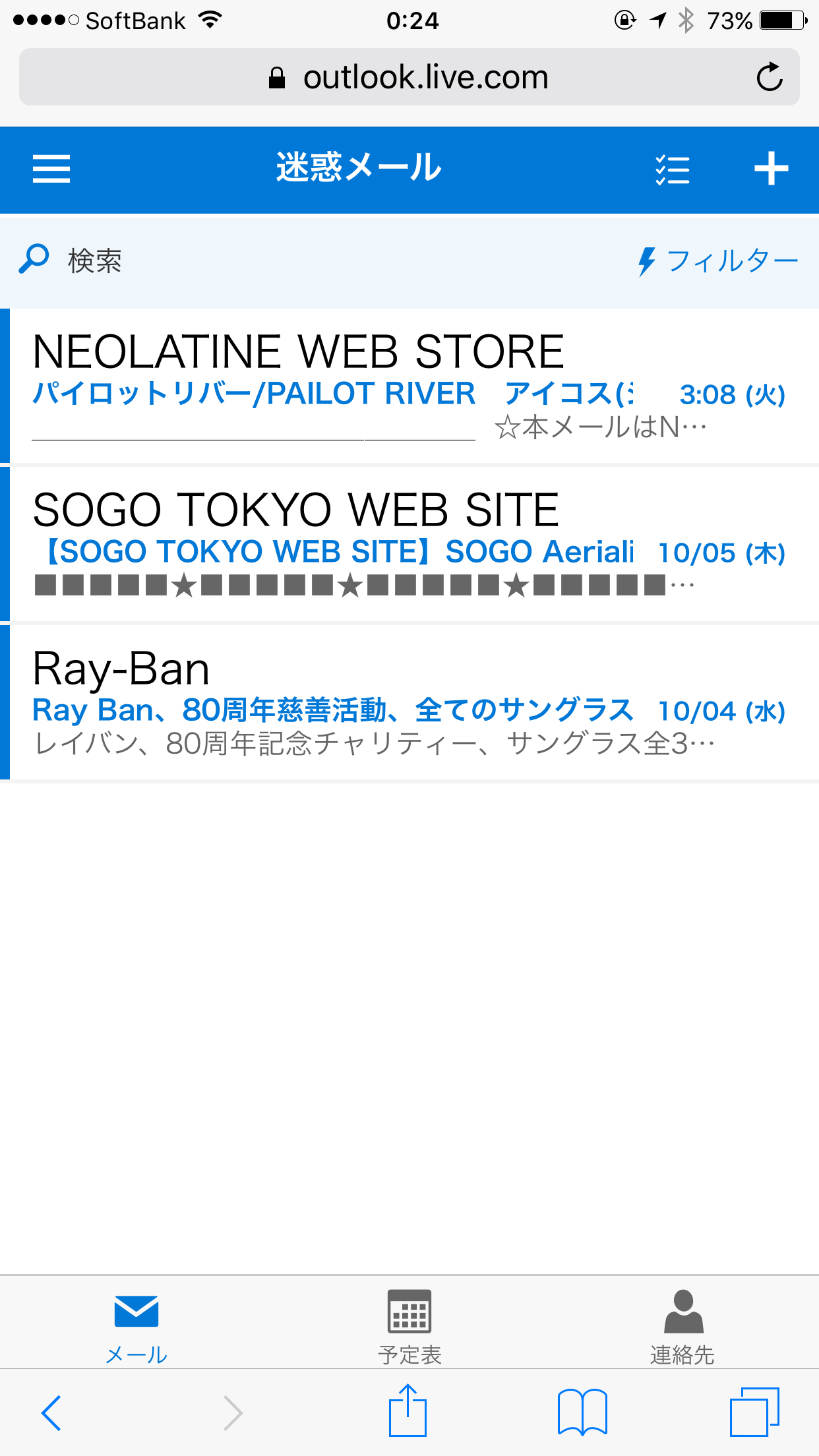 web上ではOutlookメールの迷惑メールBOXに届いているメールが、