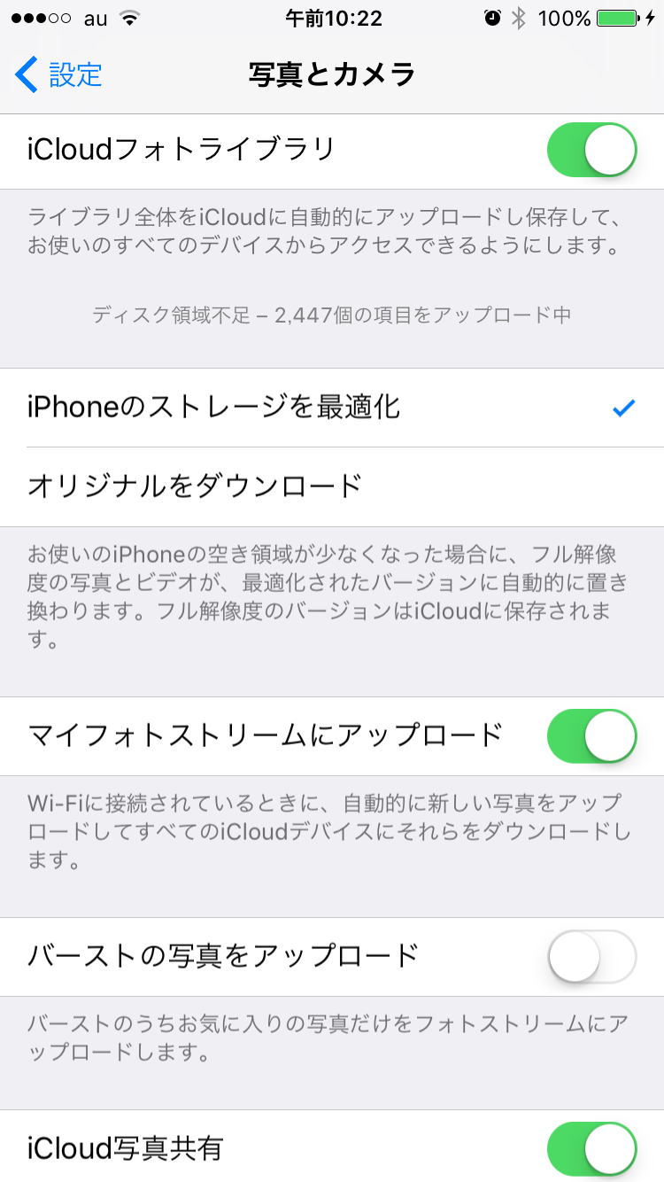 iCloudフォトライブラリは今日もう1度オンにしましたが直りません、、とりあえず現在の設定のページのスクショを載せさせていただきます( .. )