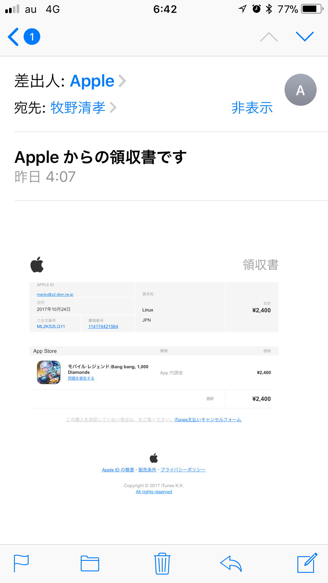 スレッドに付いたマーク ランキングトップの返信 ユーザのユーザプロフィール: 木藤 木藤 ユーザレベル: レベル 7 21,349 ポイント 2017/10/24 15:12 airfloat0223 への返信 鉄板でフィッシングメール、リンク等をクリックしてはいけません。本物の領収書メールにキャンセルのリンクは有りません。 返信 リンク