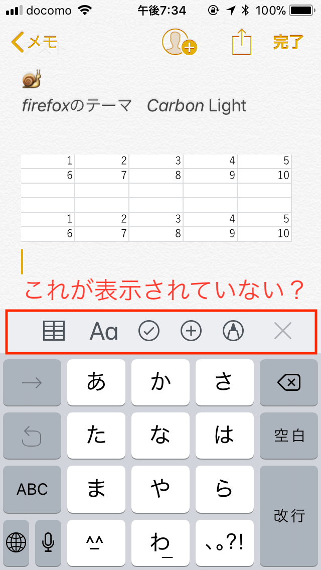 iOS 11 で「メモ」アプリケーションに追加された機能(書類スキャン、表の追加)を使いたいのですが、キーボードの上に表示されるはずのツールバーが表示されません。