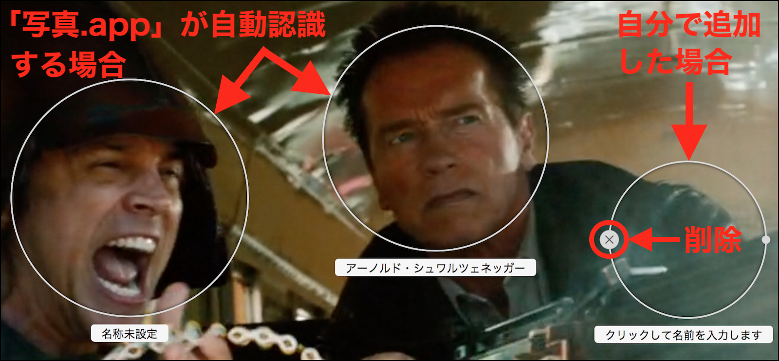 人の顔が写った写真で、カーソルを人の顔に近付けた際に表示される「 X 」印の有るサークルは、人の名前を追加する際に写真の「情報」ウインドウの「+」ボタンをクリックして自分で追加した物ですので、移動や削除が自由に出来ますが、「 X 」印の無いサークルは、「写真.app」が人の顔である事を認識して自動的に表示している物ですので、移動や削除は出来ませんが、非表示にする事は出来ます。