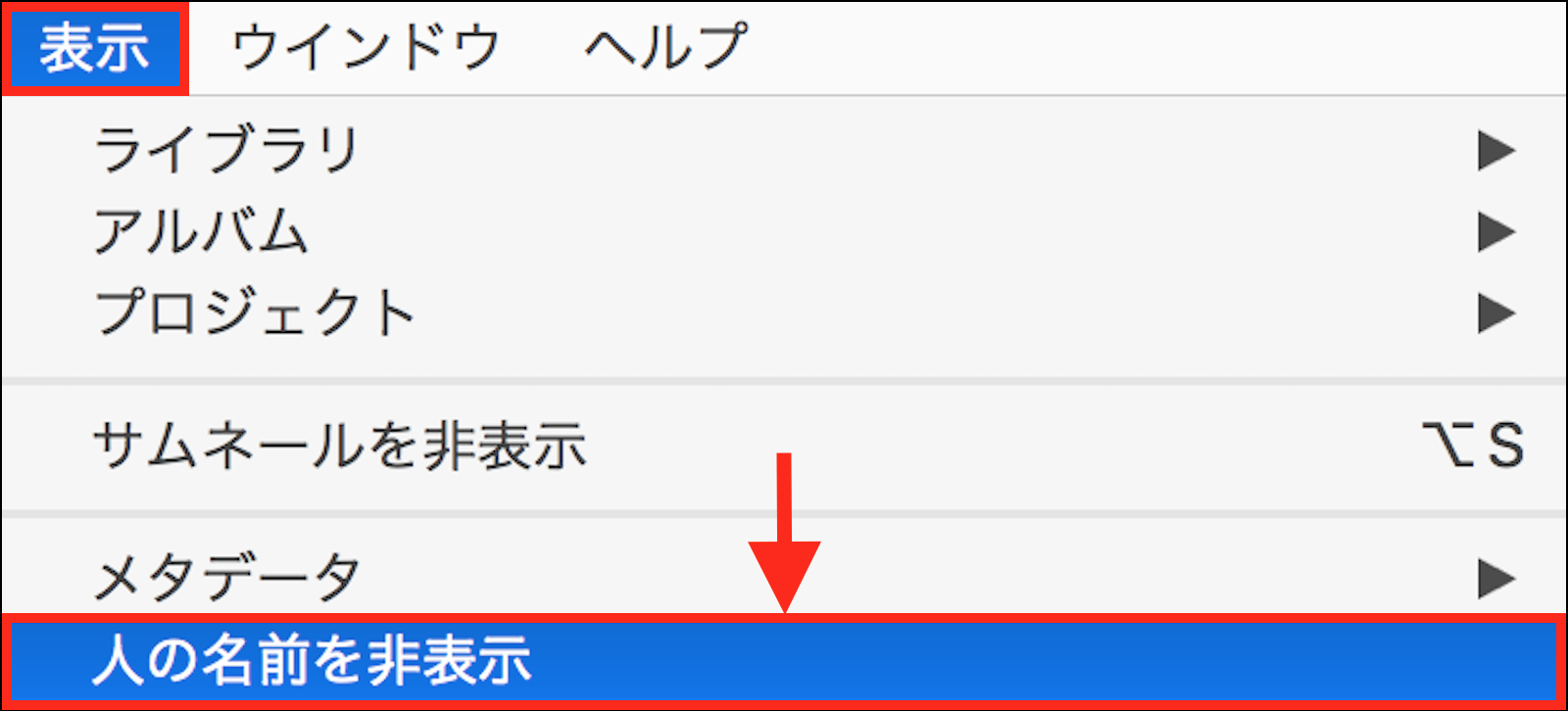 「表示」メニュー >「人の名前を非表示」を選択すると、
