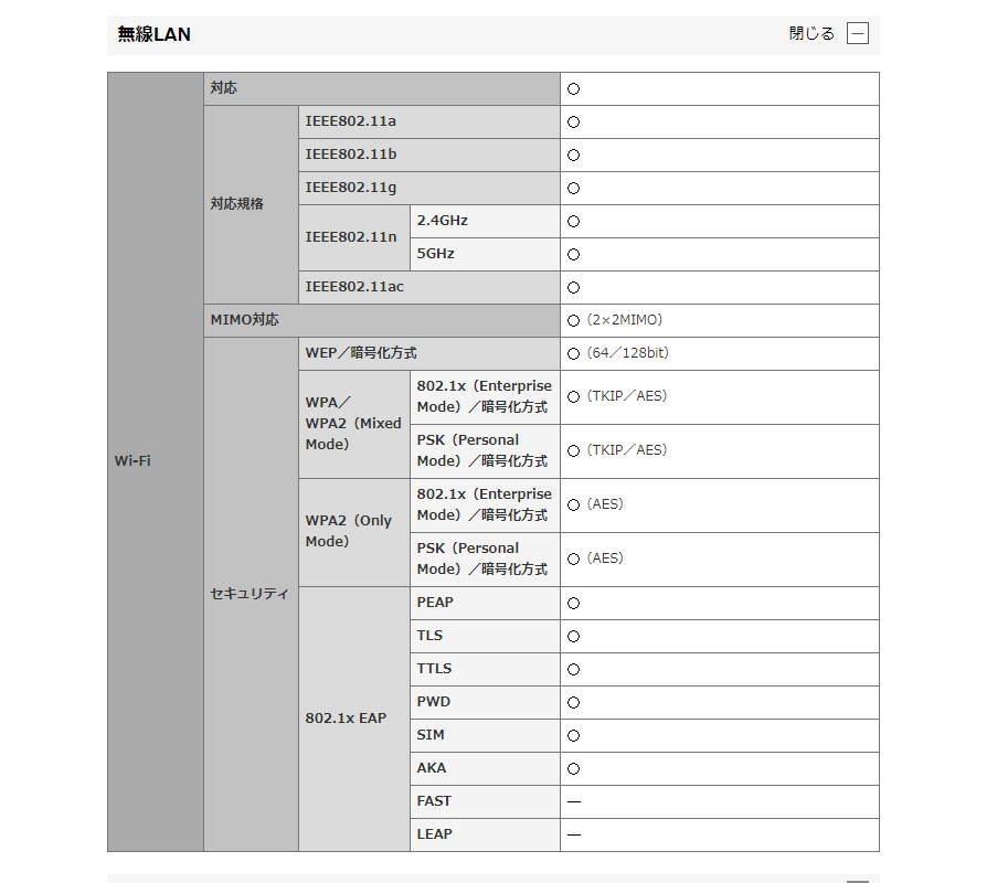 この仕様表で、WPA2 (Only Mode)のPSKなら、アップル製品も問題なく繋がるはずなんですが。WPA/WPA2 (Mixed Mode) でも繋がるはずではあります(でもセキュリティが甘くなりますのでお勧めしません)。