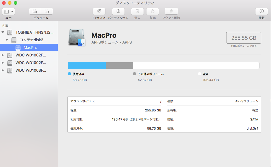 OSが立ち上がった状態でディスクユーティリティでSSDをAPFSにパーティショニング