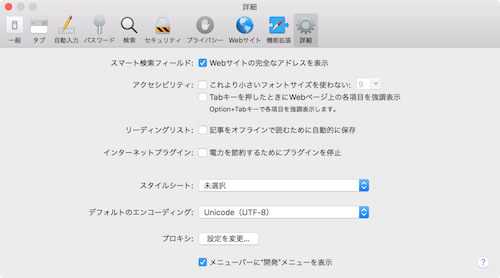 当方の環境ではApple公式案内による「Safari」>「環境設定」>「詳細」で、