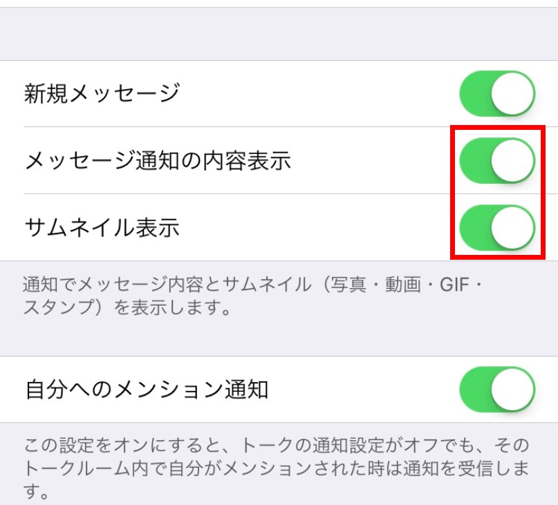 「メッセージ通知の内容表示」「サムネイル表示」もオンになっていることを確認してみてください。