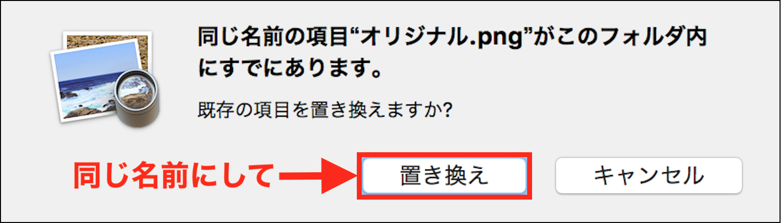 元データを複製した物を「プレビュー.app」で編集して、保存時に「保存場所」と「名前」を元データと同じに設定すると表示される下の画像の様なダイアログで、「置き換え」ボタンをクリックしたと言う事でしょうか?