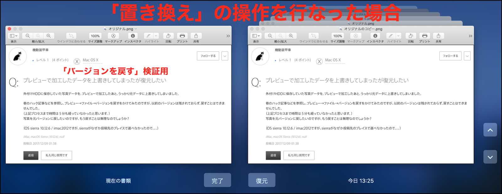 例えば、「プレビュー.app」で元データ編集後に複製し、複製した写真を「バージョンを戻す」の操作で確認すると、下の画像の様に「以前のバージョンはありません」と表示されます。