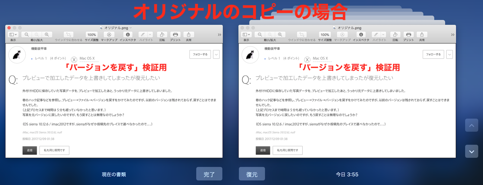 例えば、「プレビュー.app」で元データ編集後に複製し、複製した写真を「バージョンを戻す」の操作で確認すると、下の画像の様に「以前のバージョンはありません」と表示されます。