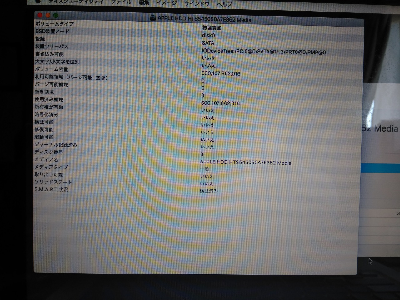 以下はディスクユーティリティーで見ることができる、HDDの現時点での情報です。問題解決のヒントとなれば幸いです。