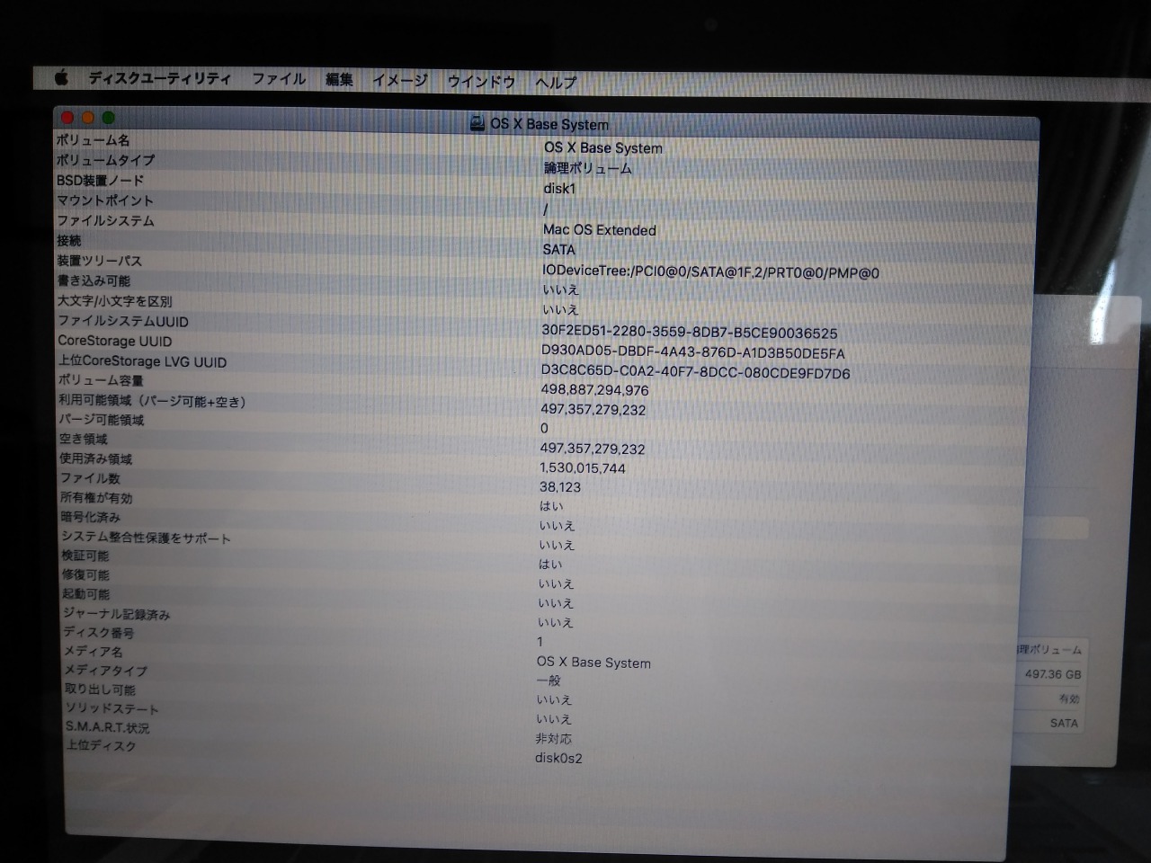 ーディスクユーティリティー>OSX Base System を開くと、前には200GBほどの容量があったものがたったの1.5GBになっている(このこと自体には、もともとデータを消去するつもりでしたので、問題はありません)