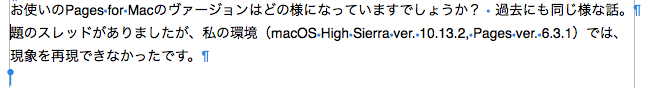 お使いのPages for Macのヴァージョンはどの様になっていますでしょうか? 過去にも同じ様な話題のスレッドがありましたが、私の環境(macOS High Sierra ver. 10.13.2, Pages ver. 6.3.1)では、現象を再現できなかったです。