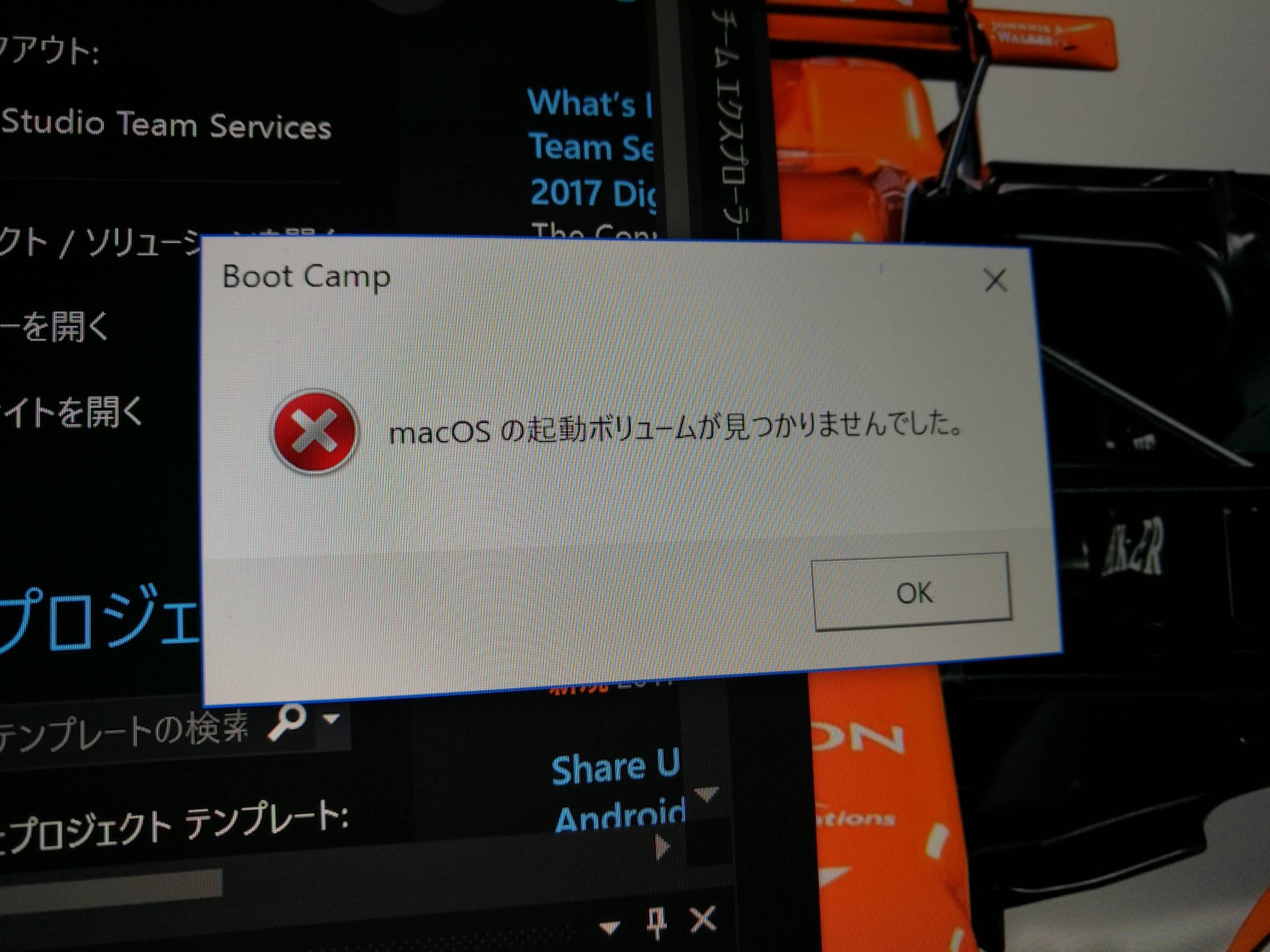 試しに、Windows10側のbootcampのコントロールパネルから「macosで再起動」という項目を選んで再起動しようとしたのですが、「macosの起動ボリュームが見つかりませんでした」というメッセージが表示され、macosを起動することは出来ませんでした。