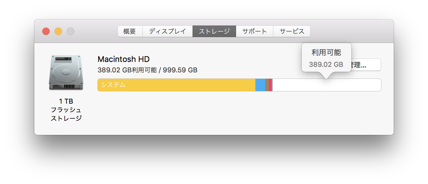なお,先日Googleフォト(300GB程度)の同期をやめ,保存していたものを消去しました.OSがHighSierraですので,もしかしたらAPFSの影響かな...とも思いますが,残り100GBを切るとさすがに精神衛生上よろしくないため,どうにかしたいと思っています.