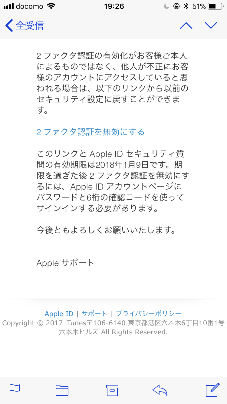 お使いのApple IDに2ファクタ認証を設定された後にそのメールを受信したのであれば、フィッシングメールではありません。 また、メールの本文にある『2ファクタ認証を無効にする』のリンク先のURLが、Appleの正規のURL(https://appleid.apple.com/)と同じであれば、問題ないです。