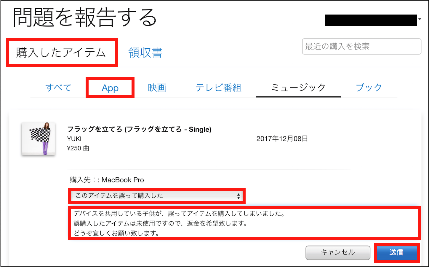 下の画像の様に、選択メニューから「このアイテムを誤って購入した」を選択し、「問題の説明」の記入欄に、アイテムを誤購入した経緯と返金を希望する旨を入力して、「送信」ボタンをタップして下さい。