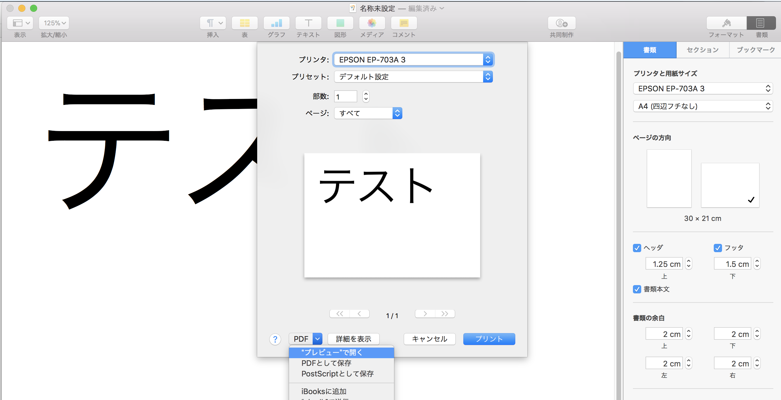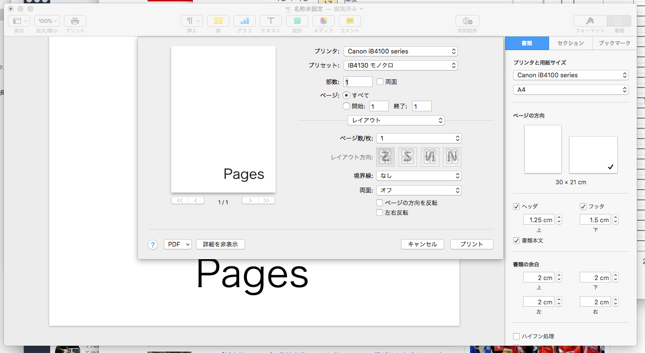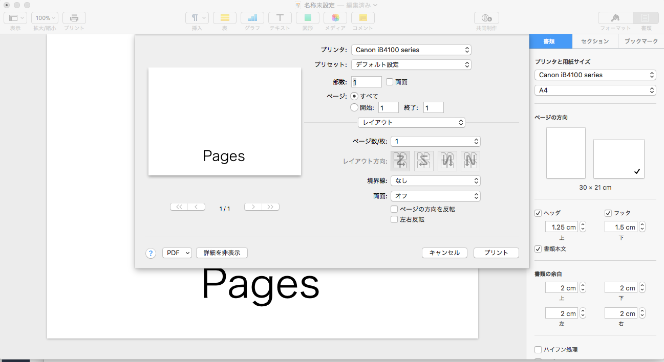 「プリセット」を一旦「デフォルト設定」に戻しても改善しない場合は、何らかの不具合で「Pages(6.3.1)」の「ページ方向」の設定と、macOS の「ページ設定」が連動していない可能性が有りますので、「shift」+「command」+「P」キーで「ページ設定」のプルダウンパネルを表示させ、「Pages(6.3.1)」の「ページ方向」の設定と異なる方向(縦向き)が選択されている場合は、「横向き」のアイコンを選択し、「OK」ボタンをクリックしてから「command」+「P」キーで「プリント設定」のプルダウンパネルを表示させて見て下さい。