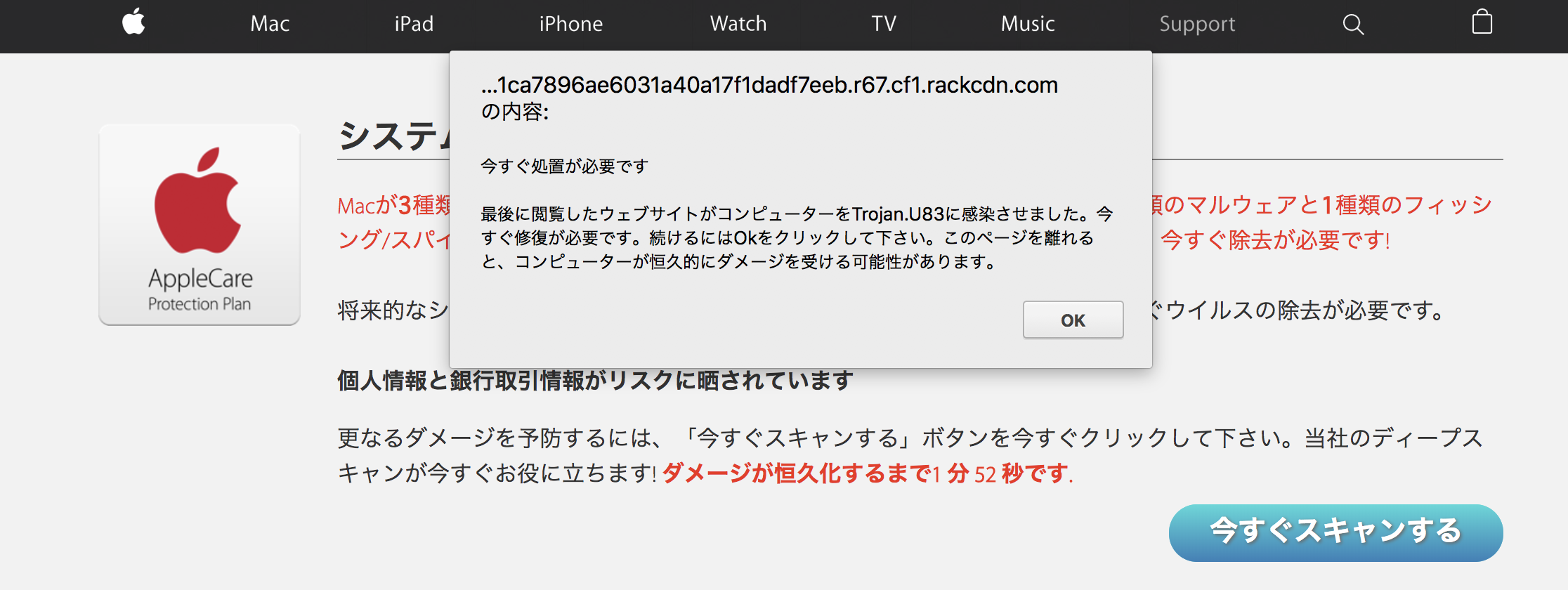 そもそも、「Trojan.U83を検出しました」という正しい日本語ではなく、「Trojan.U83に感染させました」という笑っちゃうような日本語表記になっている時点で、まともな日本語対応のウイルス対策ソフトやAppleの警告表示ではありません。