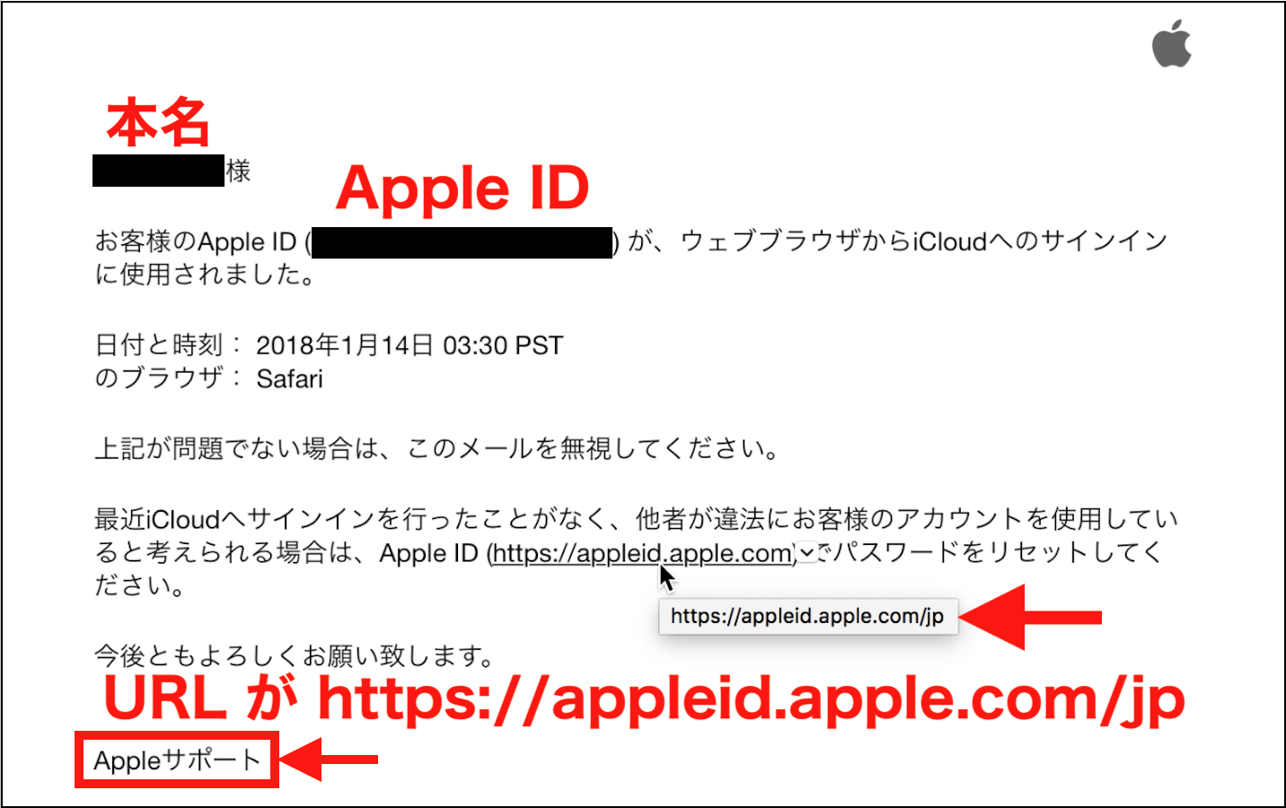 (Apple ID はメールアドレスなので、偽メールに記載されていても不思議ではありませんが、「本名(フルネーム)」が記載されていない場合は、偽メール確定です)