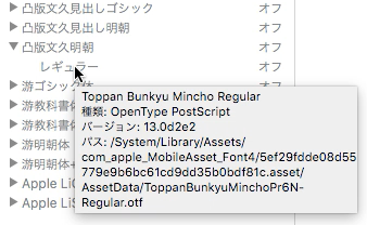 例えば凸版文久明朝ですが、Fontbookの中の一覧に存在し、実際にアプリケーション上でも使用できます。