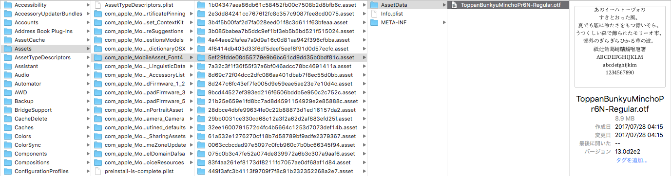 見ていたら、ヒラギノがシステムのフォントライブラリにあるだけで、他の日本語フォントは