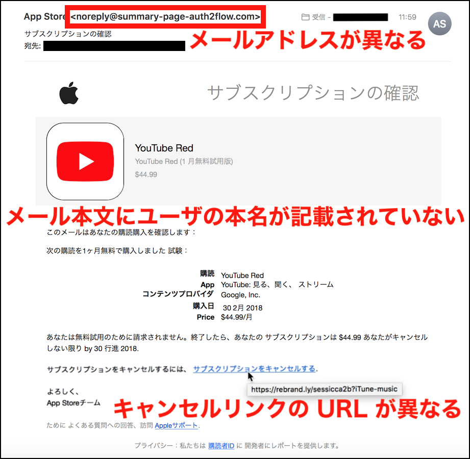 ● Apple からの本物の「購読の確認」メールのアドレスは、「no_reply@email.apple.com」になります。