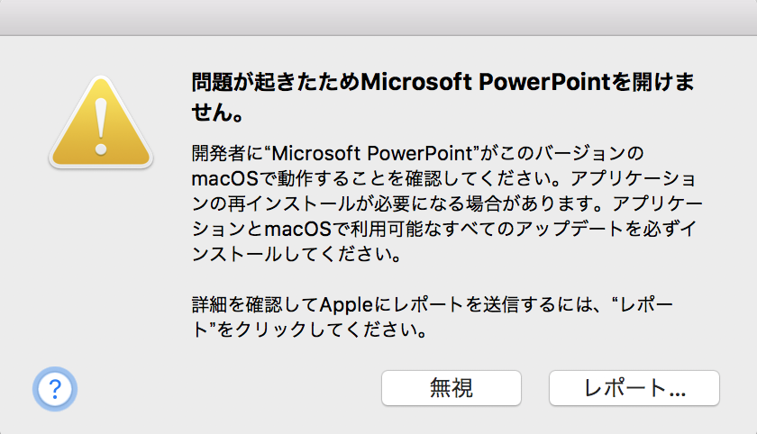 MacBookPro (mac OS Hight Sierra ver.10.13.3)でPowerPointを起動させようとすると、下のポップアップが表示され、開くことが出来ません。