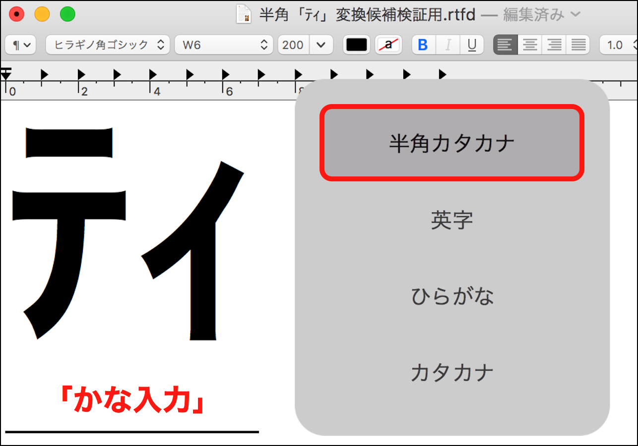 かな入力で「てぃ」を変換すると候補に出る半角カナが「チ」になる