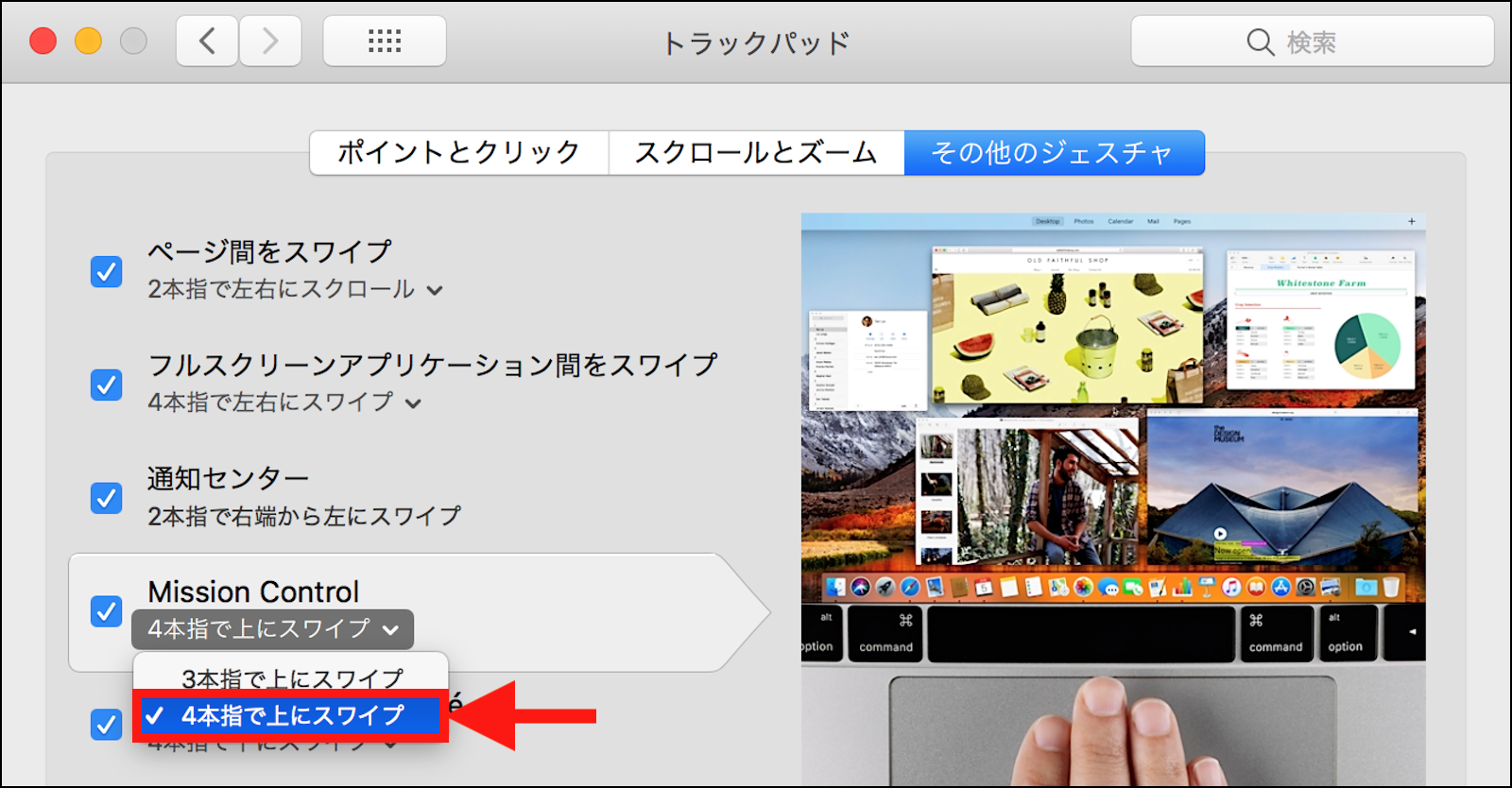 また、「Global」で「Mission Control」のジェスチャの設定を行なっていない場合は、「システム環境設定」>「トラックパッド」>「その他のジェスチャ」>「Mission Control」のジェスチャを「4本指で上へスワイプ」に設定して見ては如何でしょうか?