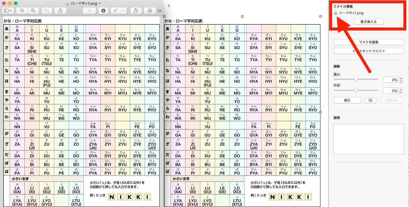添付して頂いたオリジナルのpng画像(ローマ字+1.png)をPages.appの書類(A4)に読み込んで見ました。 読み込んだ後に、ページ幅に合わせる形で自動的にリサイズされていました(縮小)。 その状態では確かに、ほんの少しだけピントが甘い(文字の見分けが付きにくい)様でした。 書類中の画像を選択した状態で、メニューバーの表示>インスペクタ>フォーマット>配置、とすすんで、『元のサイズ』のボタンをクリックすると、オリジナルの画像と同じ様なピント(?)で表示されます(下図)。
