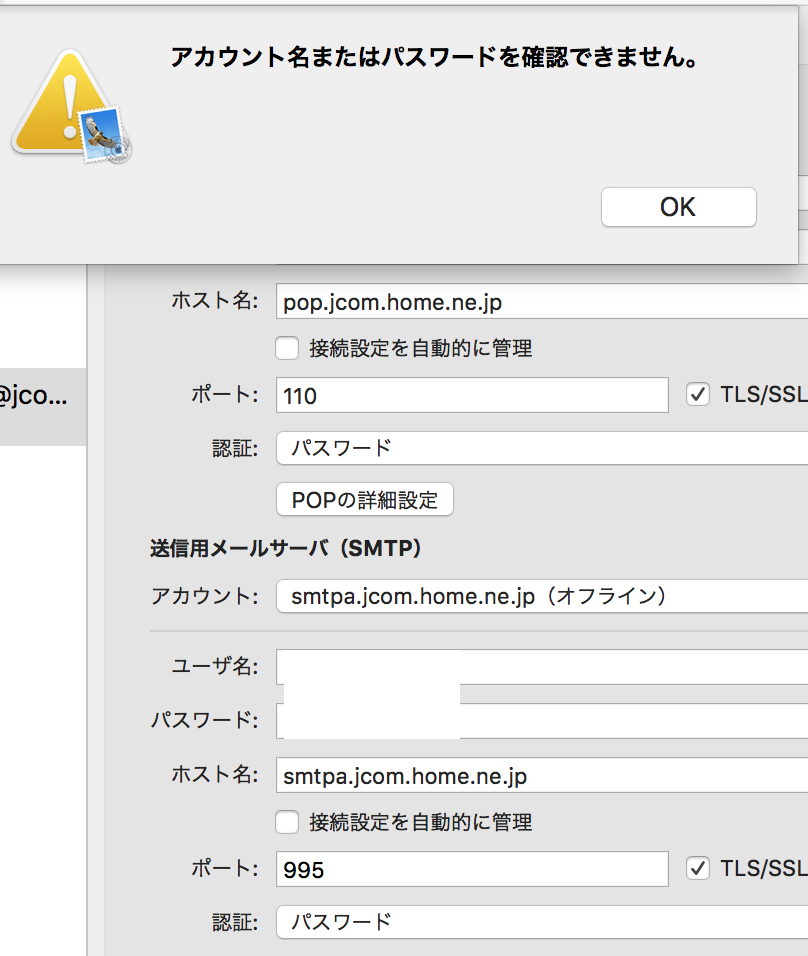 ありがとうございます。先ほどjcomに問合せて確認取れました。おっしゃる通りサーバー名に変更があったようです。。macはバージョンアップでメール不具合が多いようですね。色々調べていただきありがとうございました。お手数おかけしました。