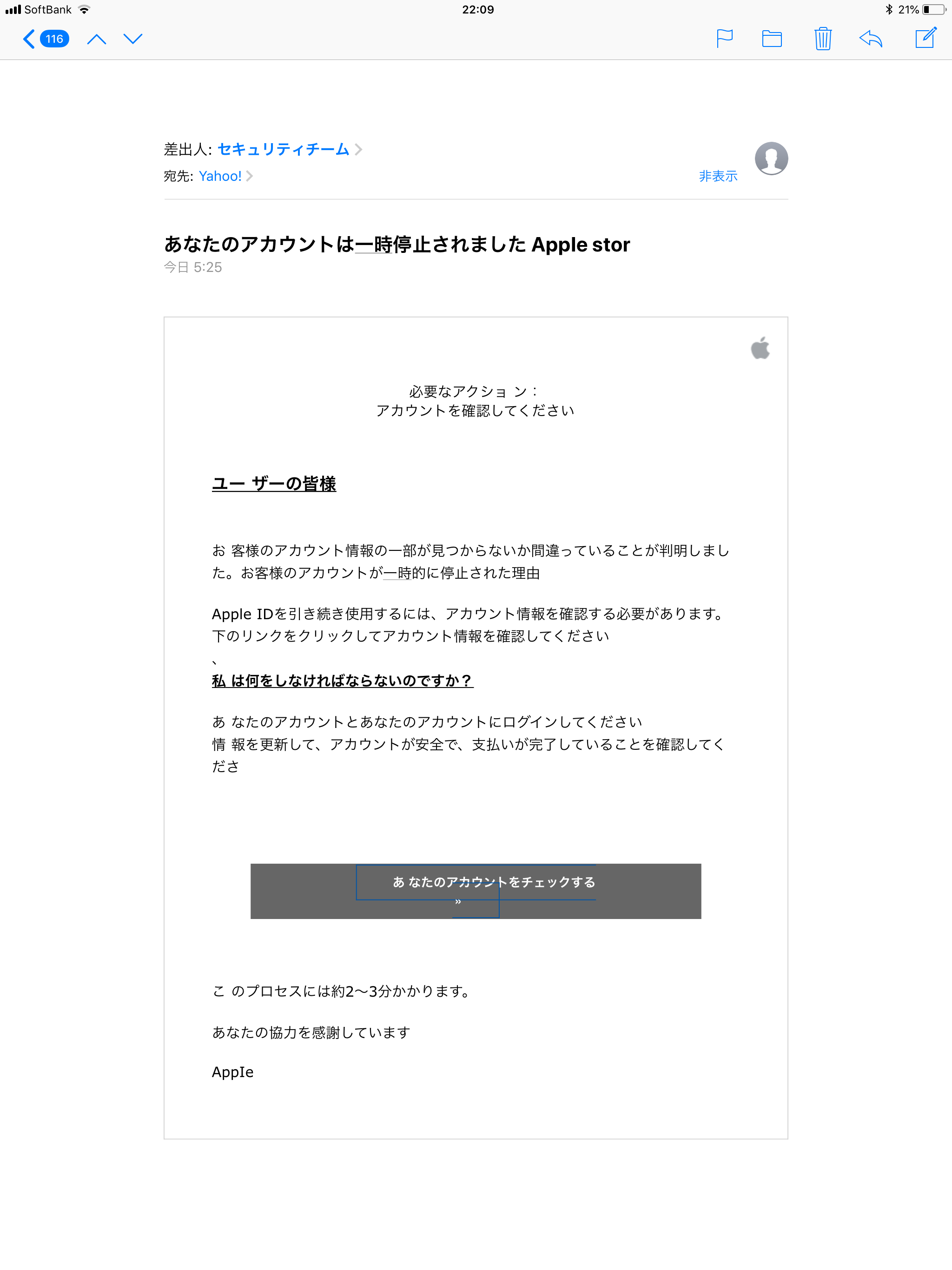(Apple ID はメールアドレスなので、偽メールに記載されていても不思議ではありませんが、「本名(フルネーム)」が記載されていない場合は、偽メール確定です)