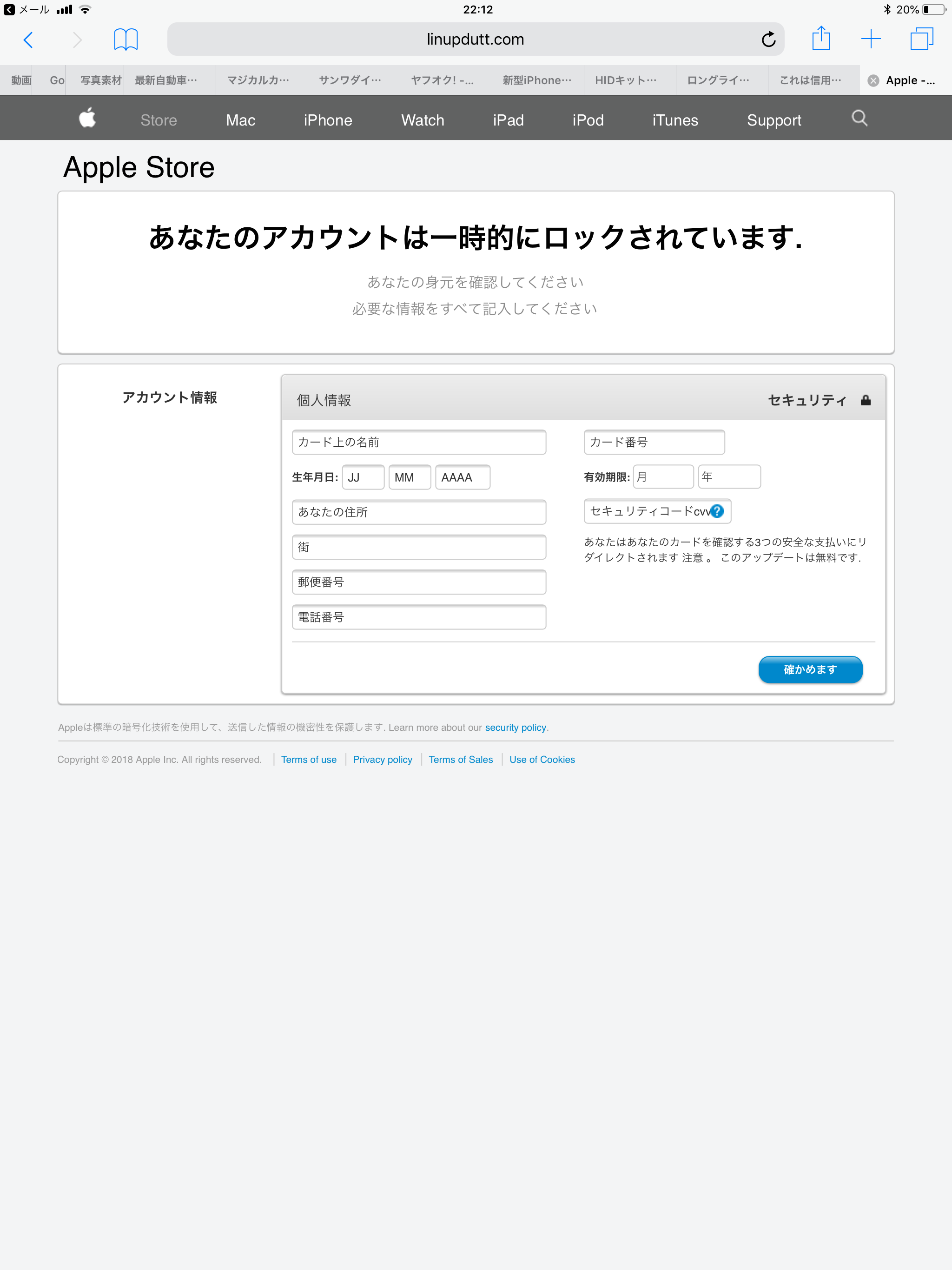 Appleからだと思い作業を進めると、IDやパスワードの入力もキーボードが切り替わらず入力しにくいし、アカウントの新規作成以外のバーをタップしてもページ移行しない、ログインできたと思いページを進めると住所やカード番号を入力するページへ。