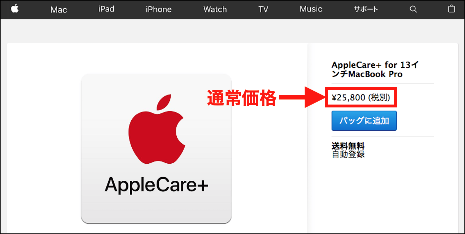 下の画像の様に、AppleCare+ for 13 インチ MacBook Pro の通常価格は 25,800 円(税別)ですが、幾らと表示されていますでしょうか?
