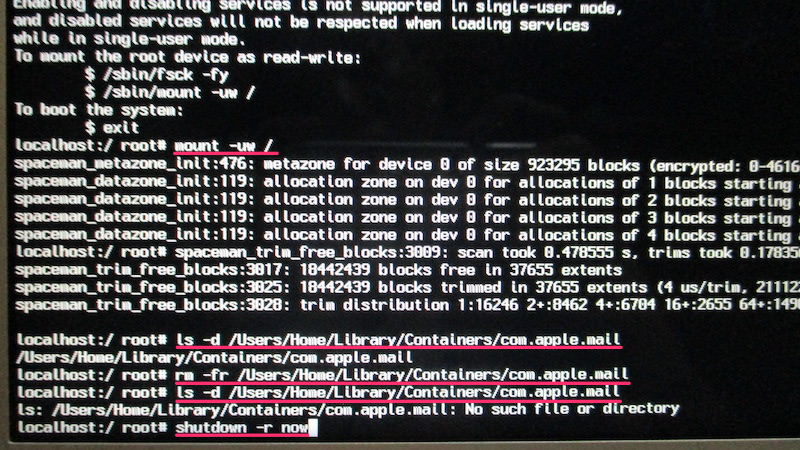 rm -fr /Users/Home/Library/Containers/com.apple.mail