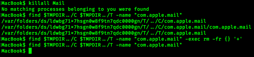 試しに、find $TMPDIR../C $TMPDIR../T -name "com.apple.mail" -exec rm -fr {} '+'を実行してみて下さい。